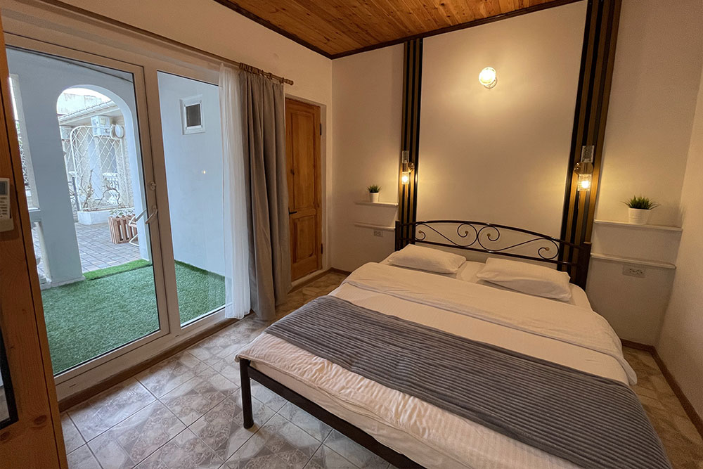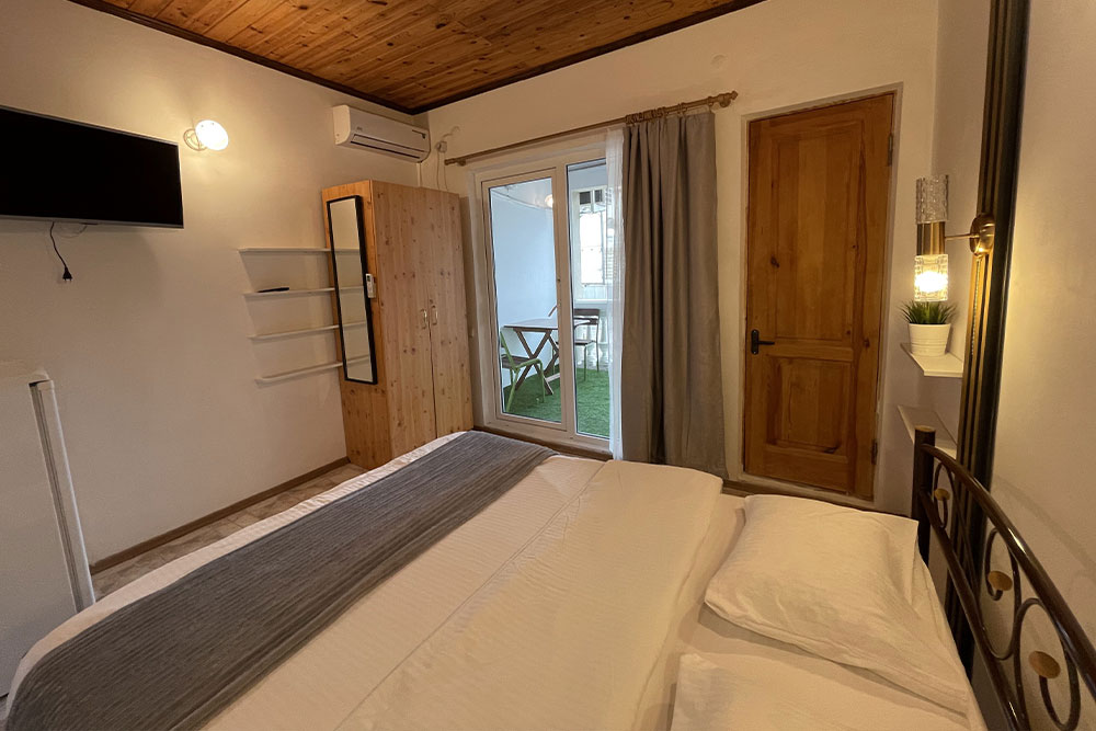 В номере: 2-х спальная деревянная кровать с ортопедическим матрацем, 2 тумбочки со светильниками, шкаф, банкетки, плазменный телевизор, холодильник, электрочайник и набор необходимой посуды (тарелки, стаканы, ложки, вилки). На территории есть WI-FI.
