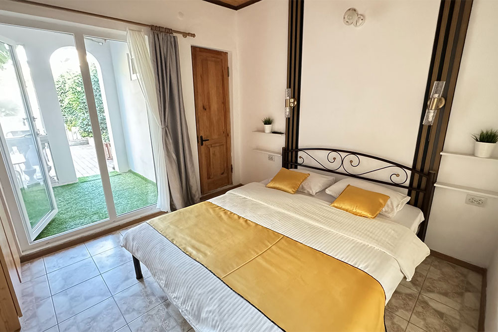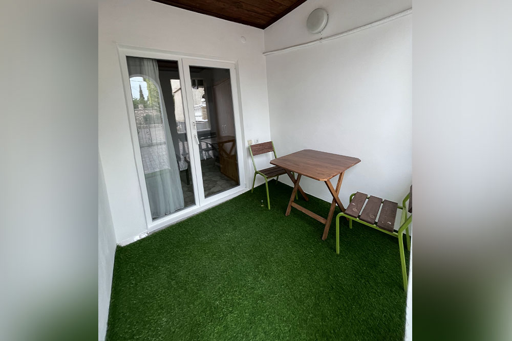 Описание: Отдельный вход с уютной террасой, украшенной живыми цветами в вазонах. На террасе – деревянная дачная мебель (стол и стулья), здесь вы можете отдыхать, спрятавшись от горячих солнечных лучей и уютно устроившись в кресле с прохладительным напитком. Перед входом – шезлонги для принятия солнечных ванн, сушилка для белья.